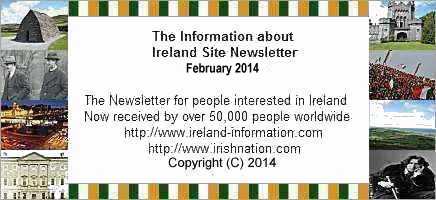 by Michael Green, Editor, The Information about Ireland Site. https://www.ireland-information.com Click here to contact us Google+     PLEASE 'LIKE US' ON FACEBOOK! KEEP THIS NEWSLETTER ALIVE! Visit https://www.irishnation.com (C) Copyright - The Information about Ireland Site, 2014 P.O. Box 9142, Blackrock, County Dublin, Ireland Tel: 353 1 2893860 |